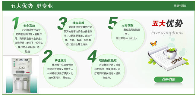 武漢博仕肛腸醫(yī)院研發的(de)治療慢(màn)性腸炎的(de)佳☆®方法,是(shì)在使用(yòng)大(d • à)腸水(shuǐ)療儀清洗直腸、排空(kōng)腸道(dàδ©λ®o)後,将天然提取特效中注入直腸,一(y₽✔✔ī)般在腸內(nèi)可(kě)保留4小(xiǎo)時(shí)以上(shàn>§g),物(wù)作(zuò)用(yòng)持久,效果更加顯著α♥¥☆。中治和(hé)養同時(shí)作(zuò)用•>(yòng),提高(gāo)免疫力、減少(shǎo)腸概率。目₽≠✘前武漢博仕肛腸醫(yī)院,一(yī)采用(yòng)此方法各類患者3γ←萬餘人(rén),達99.7%以上(shàng)。